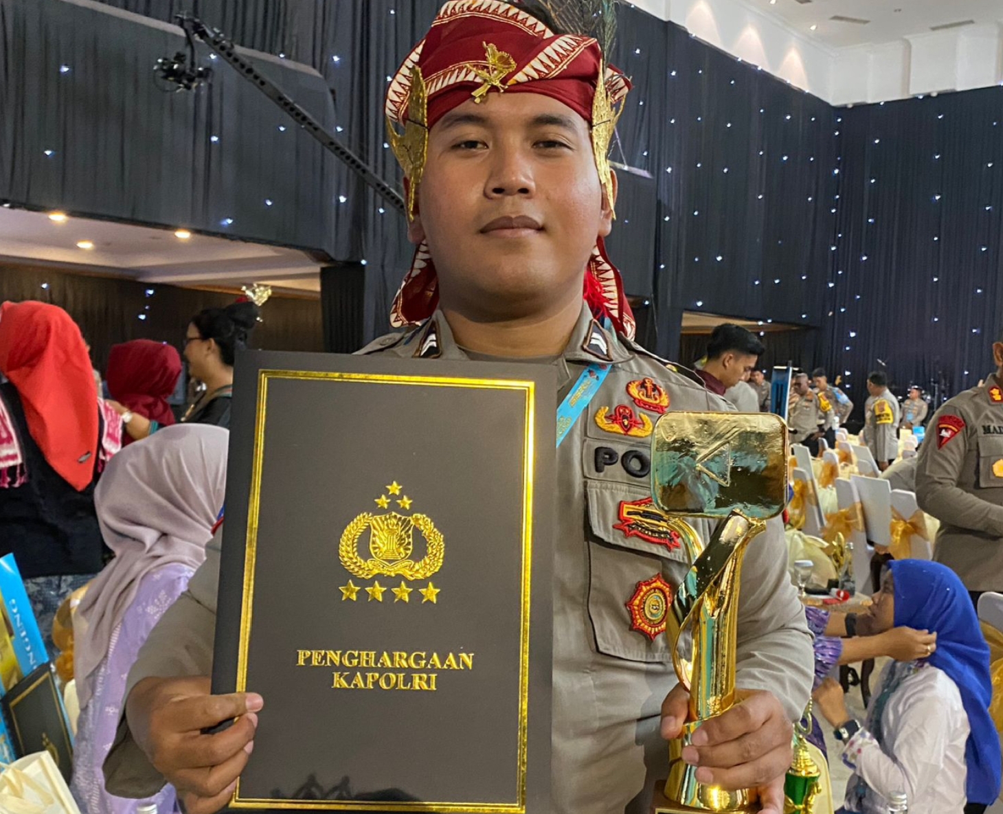 Briptu Adi tampil gagah nganggo seragam dinas lengkap lan tutup kepala adat, kaya kang diwajibaké.